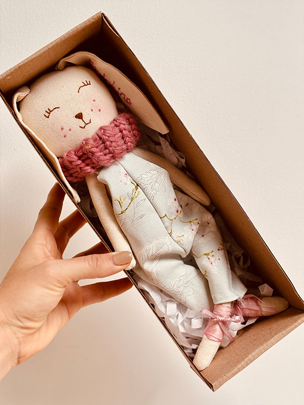 Nuestra Petita Coneja es una adorable compañer@, ideal para los más pequeños. Personalízala con telas ecológicas y suaves, y hazla aún más especial añadiendo un bordado personalizado con el nombre de tu pequeñ@. Su diseño encantador y su ropita detallada harán que se convierta en la favorit@ de tu hogar.